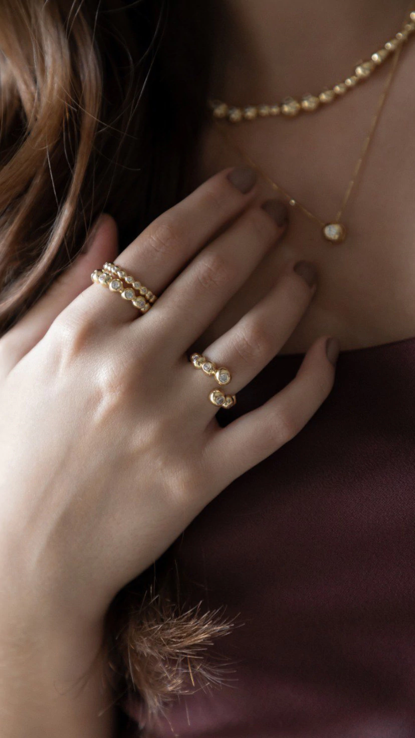Anel feminino com esferas em cravação inglesa no formato de alianças. Este anel é perfeito para ser usado sozinho ou combinado com outras joias, trazendo um toque de sofisticação.