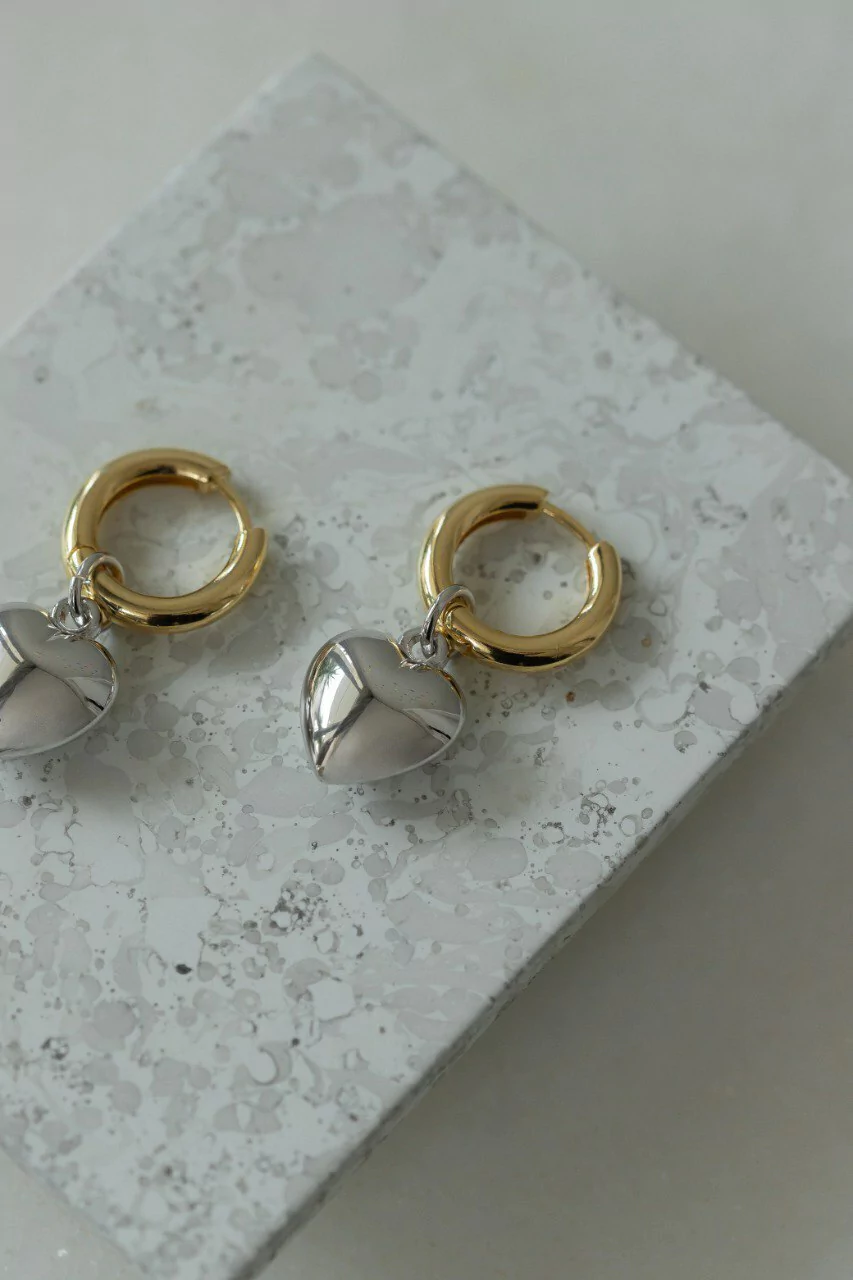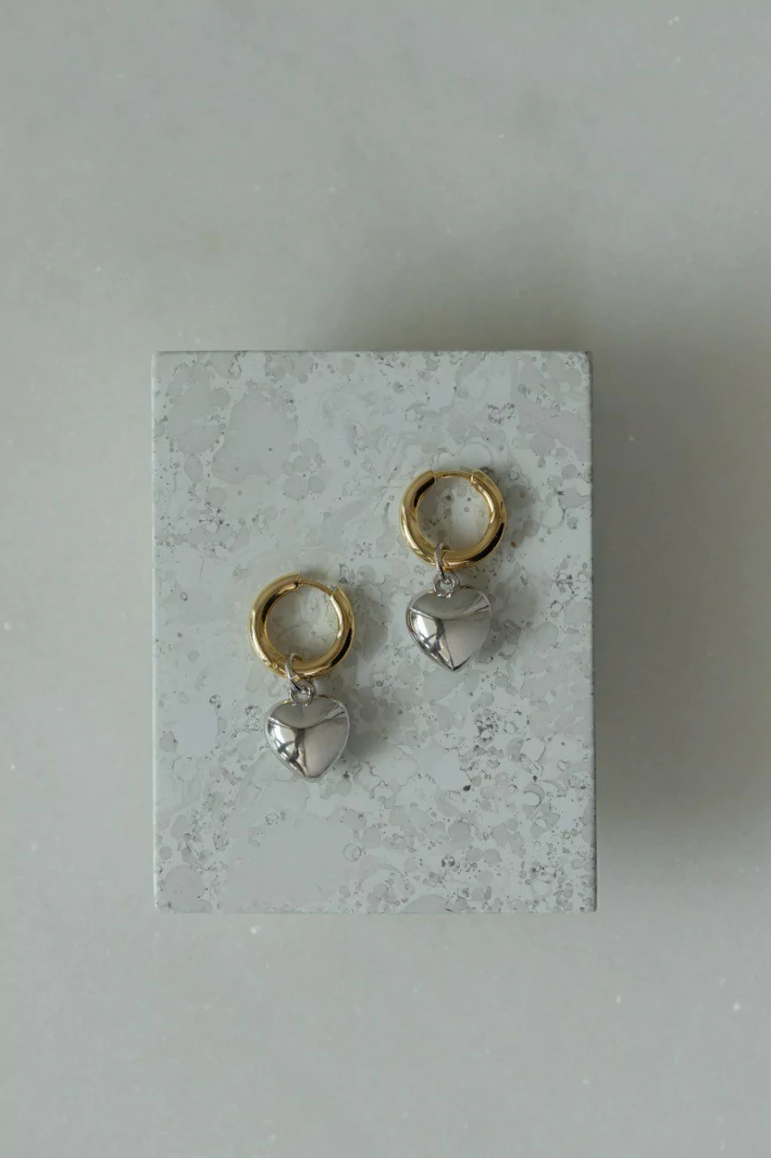 Brinco feminino de argola banho de Ouro 18k com pingente de coração em ródio branco. Ideal para compor com diferentes comprimentos e opções de brincos menores.