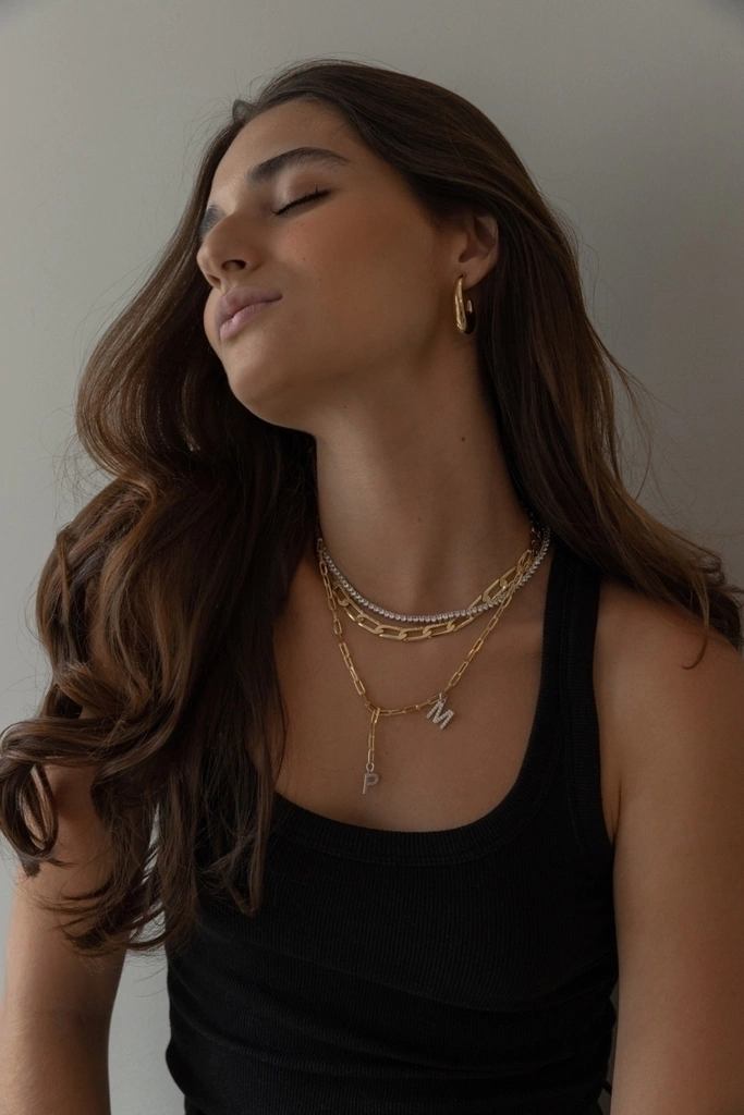 Colar feminino inicial com elos ovais banhados a ouro 18k, no estilo gravata, com duas letras cravejadas com zircônia banhado a ródio branco.